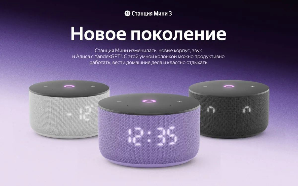 Умная колонка Яндекс Станция Мини 3 с Алисой на YaGPT Серый (Gray)Умная колонка Яндекс Станция Мини 3 с Алисой на YaGPT Лиловый (Purple)Умная колонка Яндекс Станция Мини 3 с Алисой на YaGPT Черный (Black)
